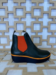 FLY LONDON Military Green leather boot with Orange detailing . Slightly tapered toe with contrasting orange coloured elastic inserts on either side make these comfortable boots the best winter boot. Flatter rubber heel.