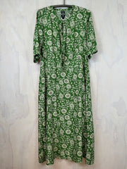 A pretty green and yellow floral print viscose dress with neck tie, long sleeves ,front bodice darts and a line skirt to below the knee. Get fresh for Spring.