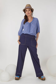 Wide Leg Sailor Girl Pant in Denim Cotton spandex with side pockets, back zip, and a large hem finish with double lemon topstitch finishing. Garment is a size small with 80 cm Waist and 106 cm in length.