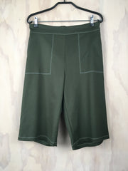 Vesta Sailor Shorts in Khaki cotton viscose spandex with side pockets, back zip, and 2cm hem finish with  double white topstitch finishing.  Garment is size xs and sits just below or to the knee. Preorder available . Sizing same as Winter Khaki Sailor Pants.