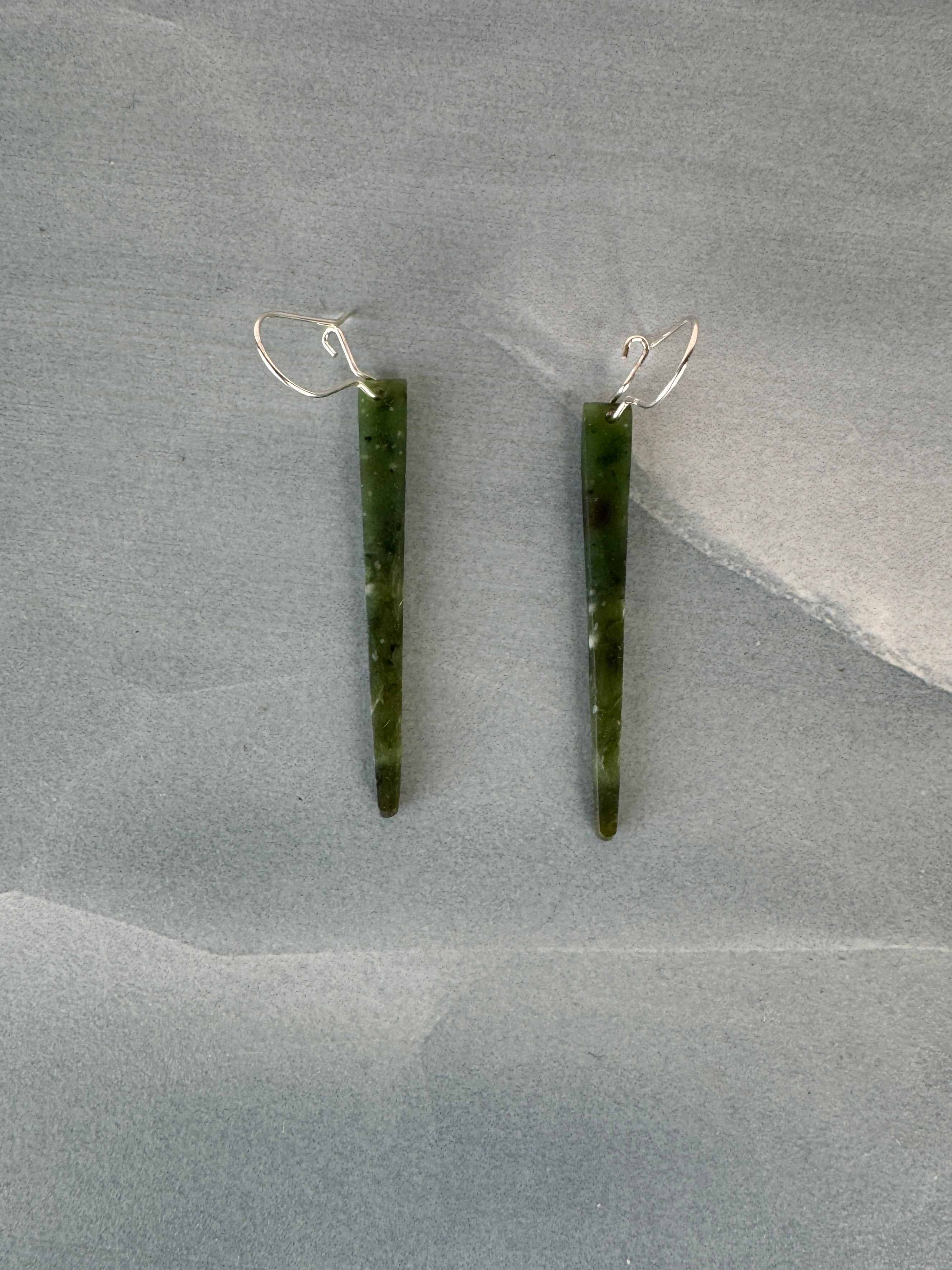 These pounamu/greenstone earrings have been shaped and carved by Tāmaki Makaurau based artist Tessa Harris.