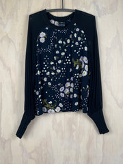 This sweet little top exudes a bit of glam and sass with a solid body and sheer raglan sleeve. The fitted knit cuff can be worn long or slightly pushed up to increase the blouson affect.