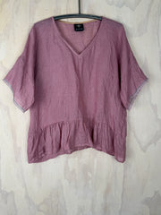 Unleash your playful side with the Juna Rufrill Top in a soft blush pink linen gauze. This relaxed fit top features a selvedge hem sleeve and a unique rulfill waist detail, while the linen gauze only gets softer with wear. Get ready to feel comfortable and effortlessly stylish in this fun top!