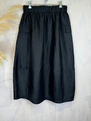 The new Juna Tulip Skirt in Noir features a comfortable elastic waist and a stylish tulip silhouette. With side cargo pockets and medium weight linen fabric, this skirt is both functional and fashionable. Perfect for any occasion, upgrade your wardrobe with this versatile piece.