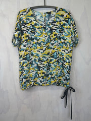 Vesta Tie top with cool print with jade, green,lemon and cream with jade satin tie at hem. Glam up over a Vesta black satin frill skirt or wear with the Vesta stripey frill skirt .