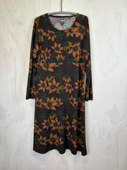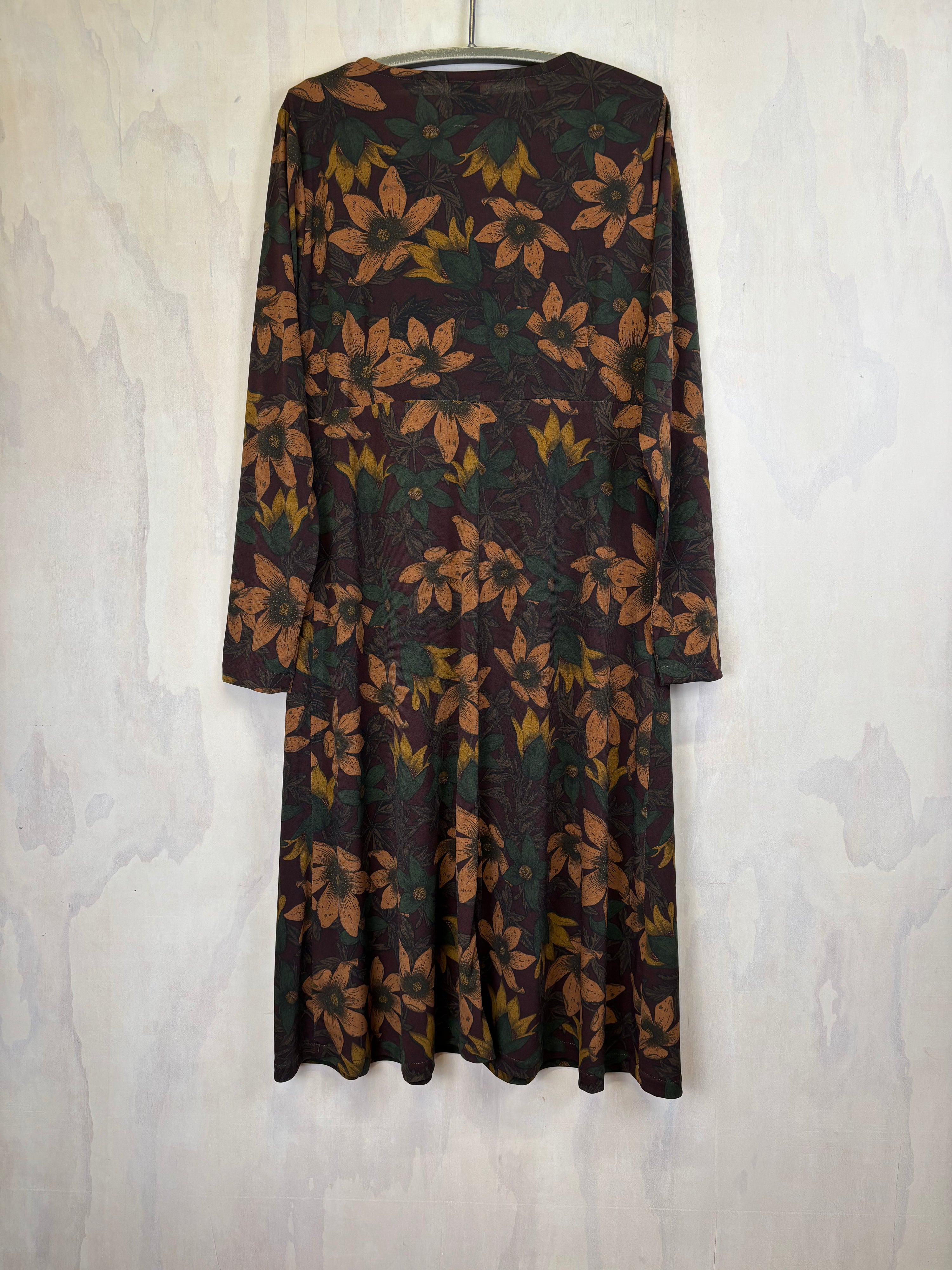 Beautiful and simple in burgundy green and gold this  season 's winter dress has bodice darts, flattering a line body to knee-length with long sleeves and a curved neck line. A comfortable piece in a soft  knit. Also available in a  cobalt blue and navy with a caramel swirl and plain black.