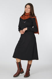 Beautiful and simple and black winter dress with bodice darts, flattering a line body to knee-length with long sleeves and a curved neck line. A comfortable piece in a soft ponti knit. Also Available in a limited cobalt blue.