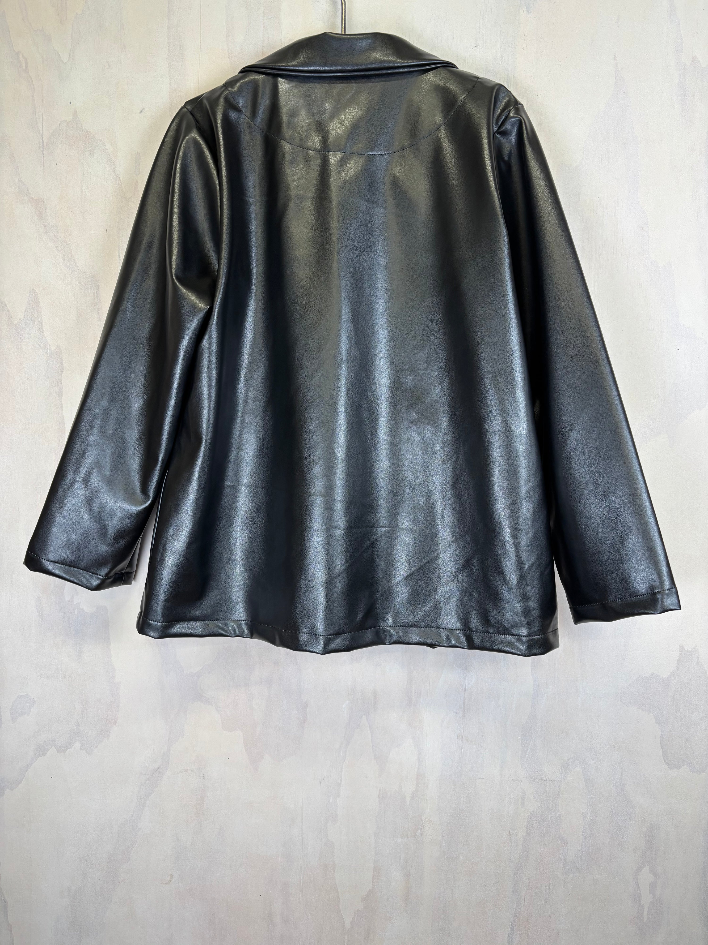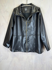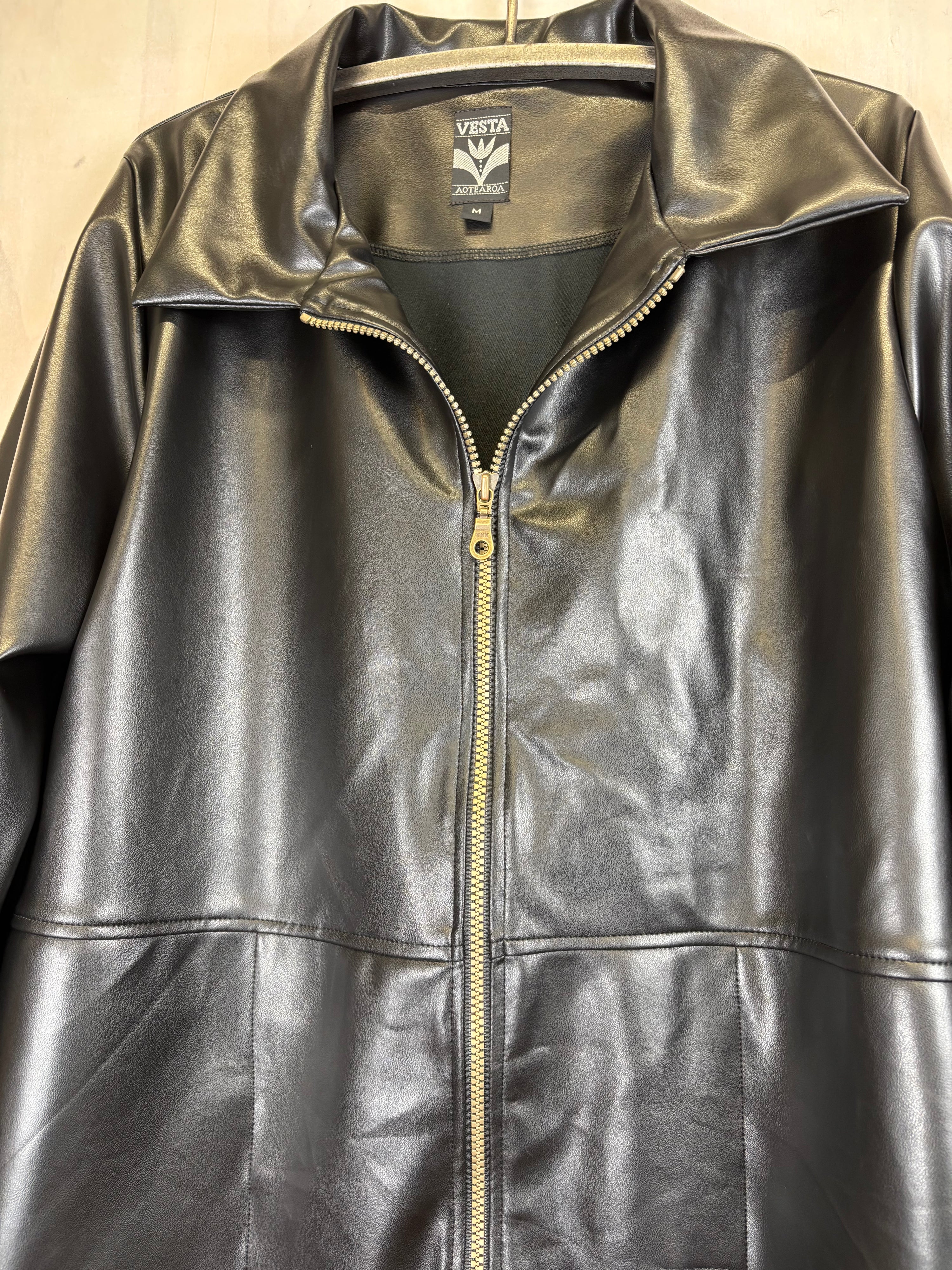 Animal friendly vinyl jacket  in caramel with  zip fastening, side pockets and feature topstitch.  Size small has a 94 cm bust and length is 67cm from shoulder to hem.