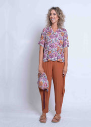 Looking for a lightweight drapey summer trouser? The Eastern Trouser in this soft viscose is perfect. Cleverly panelled cut with inset pockets and elastication at back, soft flat waistband at front. Narrower at ankle.