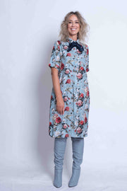 This utterly divine Dove print is a nostalgic mash up of imagery that makes us want to swoon. Covered buttons, inset pockets, patch pocket on front and curved hemline. Wear with or without a belt. Subtle A line silhouette. Birds and bees adorn old fashioned roses on a background of egg shell blue. So so dreamy..