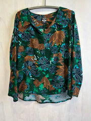 Vesta polo shirt in a soft Viscose with a vibrant print in caramels and blues on a green base  . Wear as a stand-alone piece and layer over Vesta espresso cuff pants.