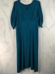 Vesta knee length summer dress in jade viscose with a simple eyelet at centre front, under bust gather on bodice, flattering front band and aline skirt for easy wear.