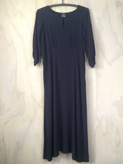 Vesta knee length dress in indigo crepe viscose with a simple eyelet at centre front, under bust gather on bodice, flattering front band and aline skirt for easy flattering wear.