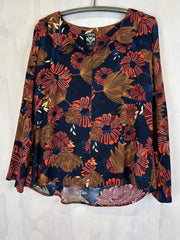 Vesta polo shirt in a soft Viscose with a vibrant print in caramels and reds on a navy base . Wear as a stand-alone piece and layer over Vesta sailor jeans in strech denim .