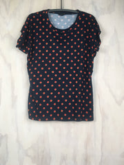 Cotton tencel spandex tee in a yellow rimmed red polkadot print on a navy base. Short sleeved and shaped through the side body. Flattering tee shirt for every day wear or layer up with a merino under top.