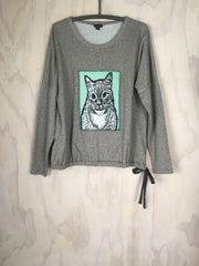 Vesta quality knit long sleeve top in tencel viscose knit with chocolate satin tie  gathered in at hem  and an eye catching cat patch .Easy but classy wear with your favourite jeans. For all you cat lovers out there.