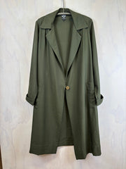 Versatile Trench coat in khaki rayon has back overlay and one button fastening , with a tie belt to wrap as needed. The trench can also be worn open to reveal your outfit for a casual or special occasion. The Large in this style is wool 80 viscose 20.