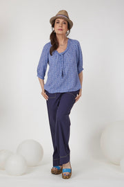 Vesta V Pleat Top in a bright white seed Print on a blue viscose base. V Neck is satin bound with 6 pleats, front darts and 3/4 sleeves . Wear over Vesta sailor jeans or denim pocket skirt.