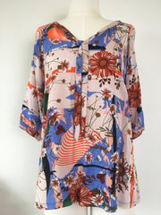 Summer Viscose top with sunflower print in blues,oranges peaches and cream. Satin bound at V with neck tie and short sleeves to elbow , can be worn everyday. Pair with Vesta Chambray Selvedge Skirt .