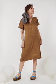 A low v neck dress in viscose acetate in cool gold with a zig zag pattern. This flattering bodice shape is bias cut for flexible fit . The skirt body nicely drapes and falls below the knee. Classy event dress .