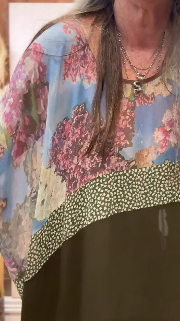 The classic Juna T Dress is the perfect way to brighten up any day or night of the year. Color blocking with a stunning botanical floral print, and combining delicate silks , this dress will be an eye-catching addition to your wardrobe! Pair it with the Juna Origami Pants, or a slip. It's one-size-fits-most, fitting sizes 8-22.
